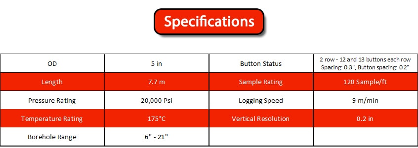 The XRMI has 6 pads armed on 6 independent arms, 25button electrodes on each pad, total 150 curves be recorded, can get resistivity image after processing. The new design can make the image more clear and work well in higher salinity drilling fluid.